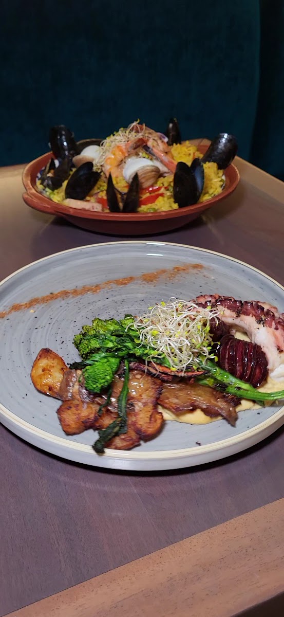 I was hoping a little more of the atmosphere, it is okay. We got the special menu of $45 each and it was good, you feel good after having entrance, main and dessert. I had the grilled octopus and the hummus was a surprised in the dish, not bad but I wasn’t expecting it. My boyfriend had the paella, and it wasn’t bad, but it had mushrooms and that took us by surprise in a bad way because we didn’t see it in the ingredients. Decent portion but I don’t believe you could share. The desserts were creme brûlée and chocolate mousse and got to say the chocolate mousse was very very silky and nice. We had cocktails and they looked nice, and the quality of the drinks felt good too. We had courtesy wine because we were celebrating a birthday, and it was a Porto, it went well with the sweets (I’m not sure if those were meant to go together, but we enjoyed it) The waiter was friendly and he answered our questions, he brought the food in the perfect temperature, and the drinks on time.