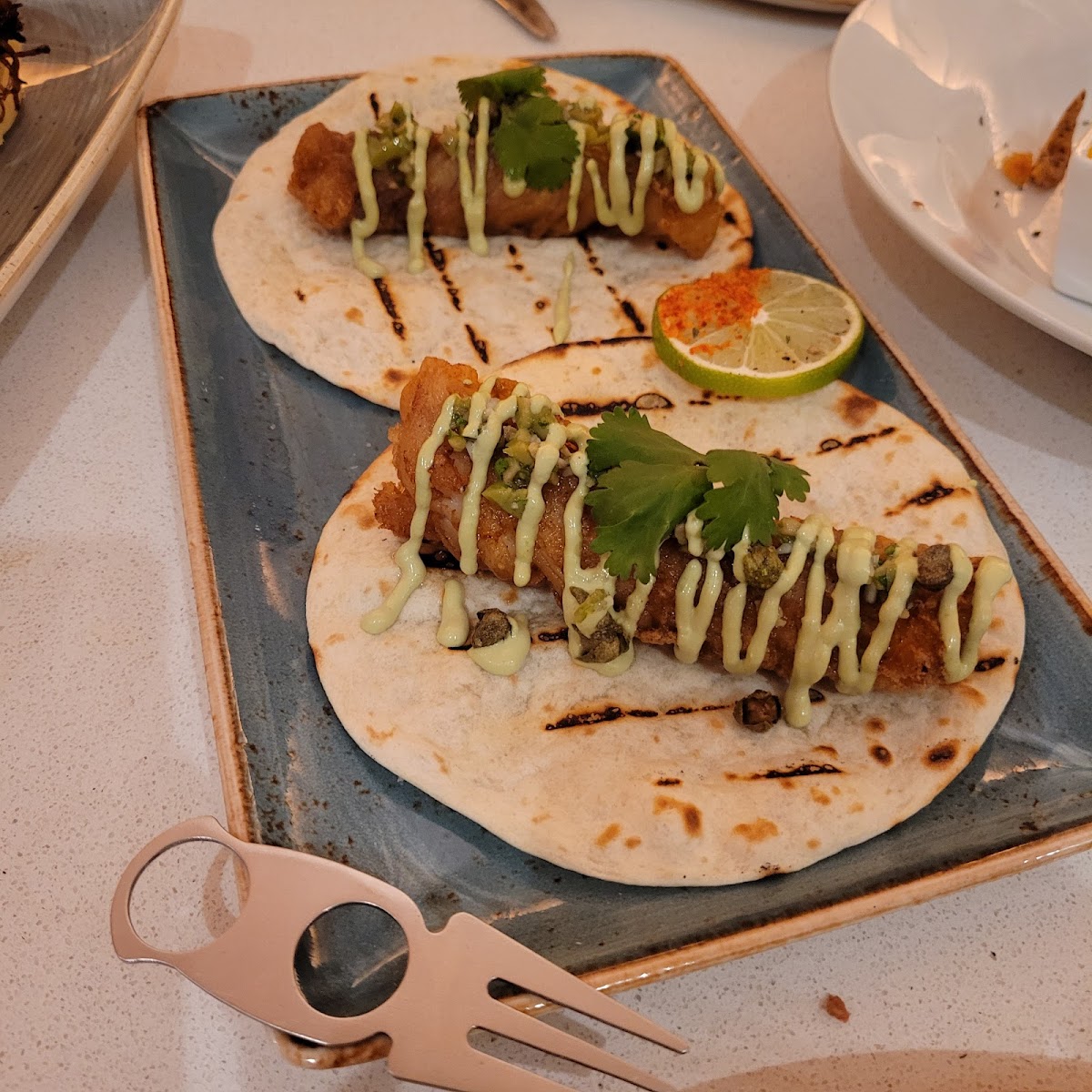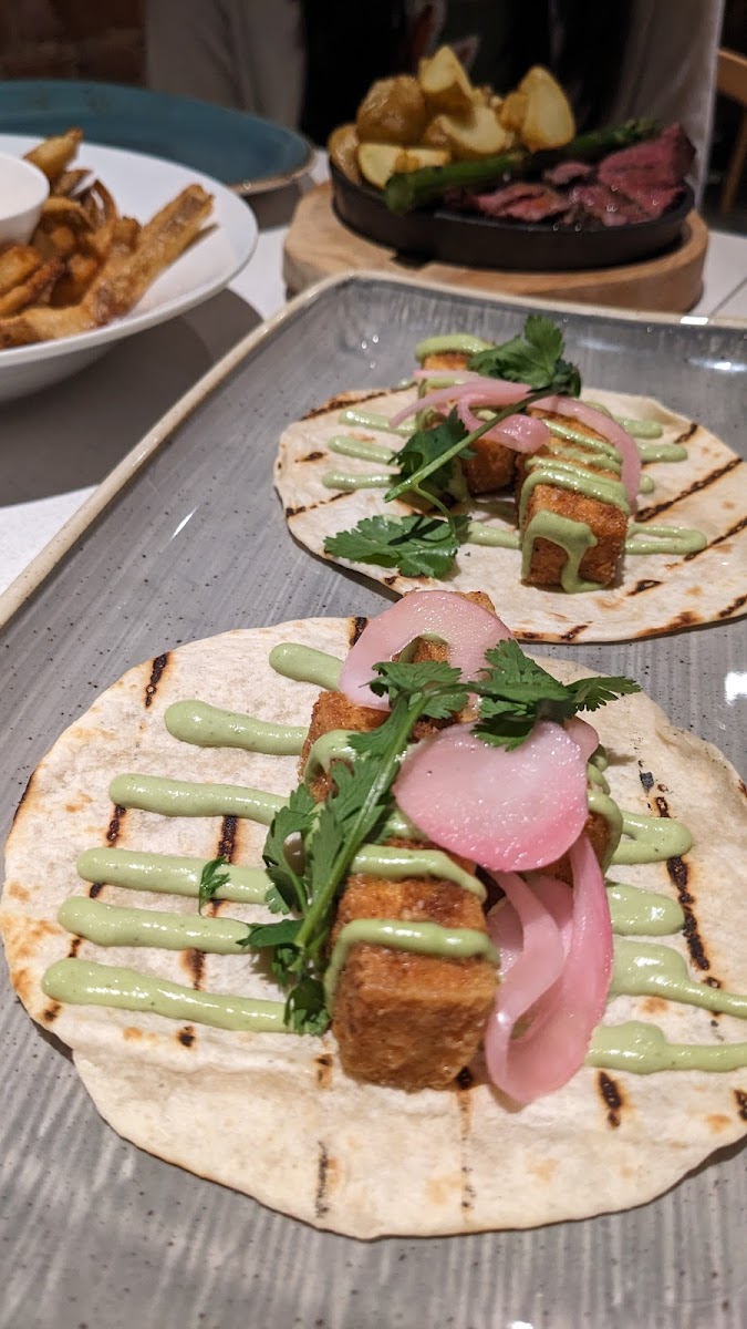 Don't miss the exquisite soft flour tortilla tacos, offering both meat and vegetarian options. The Piri Piri Tofu Taco dazzles with a cashew and coriander crema, providing a delightful and refreshing alternative. If you're keen on seafood, try the Crispy Cod Loin Taco, artfully topped with olives, salsa verde, and fried capers; it’s a dish that evokes the charm of coastal Spain.